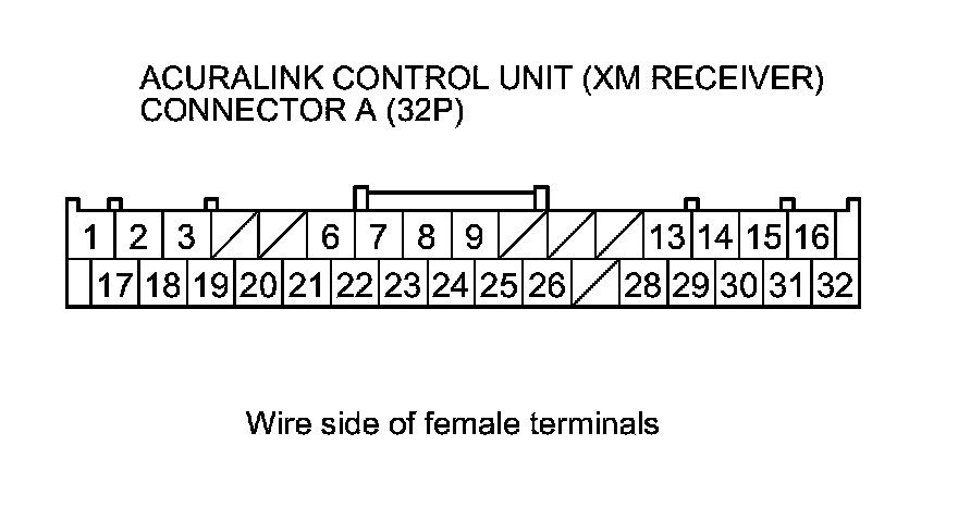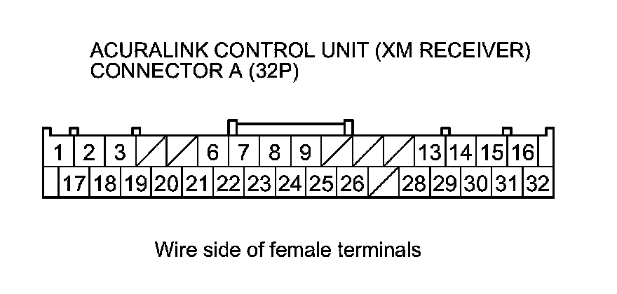10. Check for continuity between the terminals of AcuraLink control unit (XM receiver) connector A (32P) according to the table.