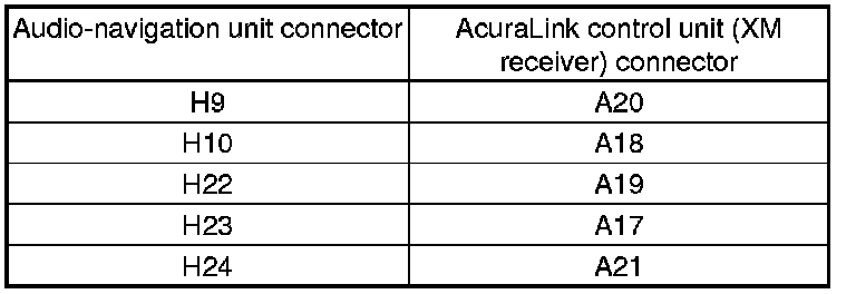 13. Check for continuity between the terminals of AcuraLink control unit (XM receiver) connector A (32P) and audio-navigation unit connector H (28P) according to the table.