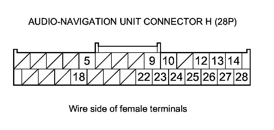 12. Check for continuity between body ground and audio-navigation unit connector H (28P) terminals No. 9, No. 10, No. 22, and No. 23 individually.