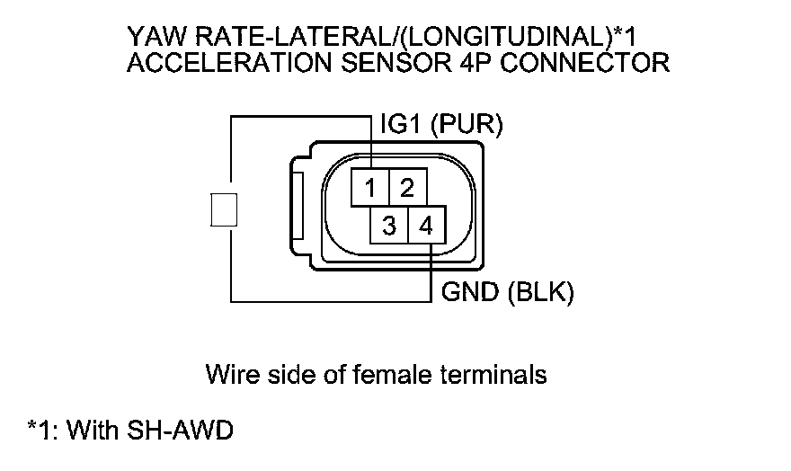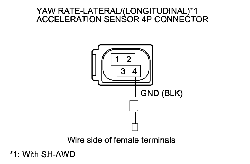 12. Measure the voltage between yaw rate-lateral acceleration sensor 4P connector or yaw rate-lateral/longitudinal acceleration sensor 4P connector terminals No. 1 and No. 4.