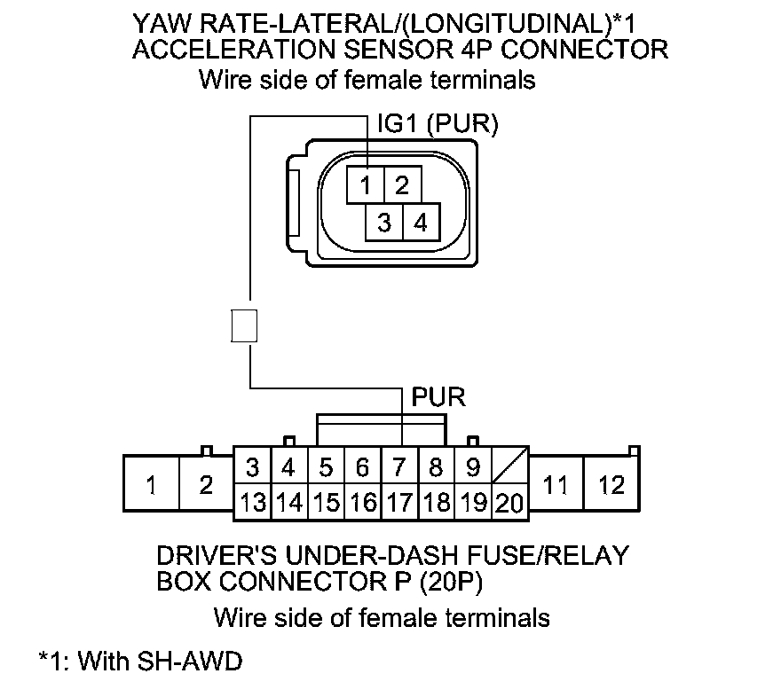 15. Check for continuity between yaw rate-lateral acceleration sensor 4P connector or yaw rate-lateral/longitudinal acceleration sensor 4P connector terminal No. 1 and driver's under-dash fuse/relay box connector P (20P) terminal No. 7.