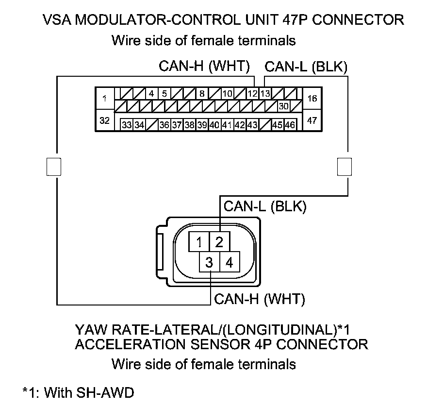 18. Check for continuity between VSA modulator-control unit 47P connector terminals No. 12, No. 13, and yaw rate-lateral acceleration sensor 4P connector or yaw rate-lateral/longitudinal acceleration sensor 4P connector terminals No. 3, No. 2 individually.