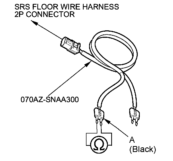 16. Measure the resistance between the terminals of the black SRS simulator lead (A). There should be an open circuit or at least 1 MOhms.