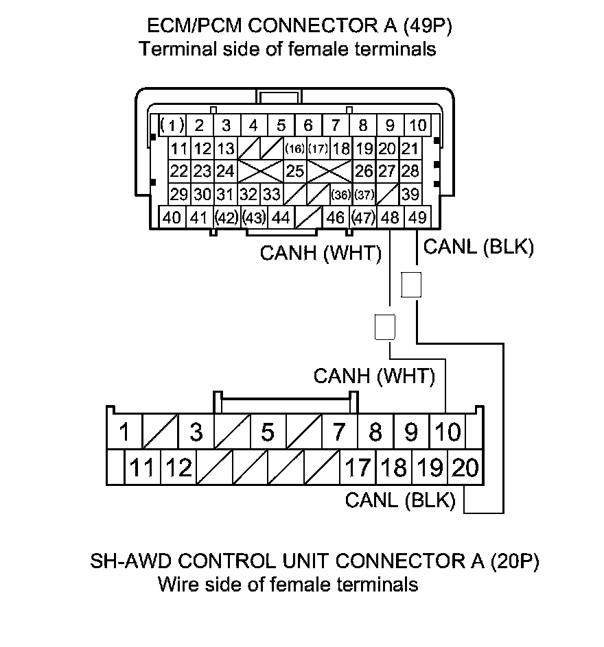 10. Check for continuity between ECM/PCM connector terminals A48, A49 and SH-AWD control unit connector terminals A10, A20 respectively.
