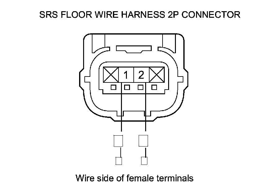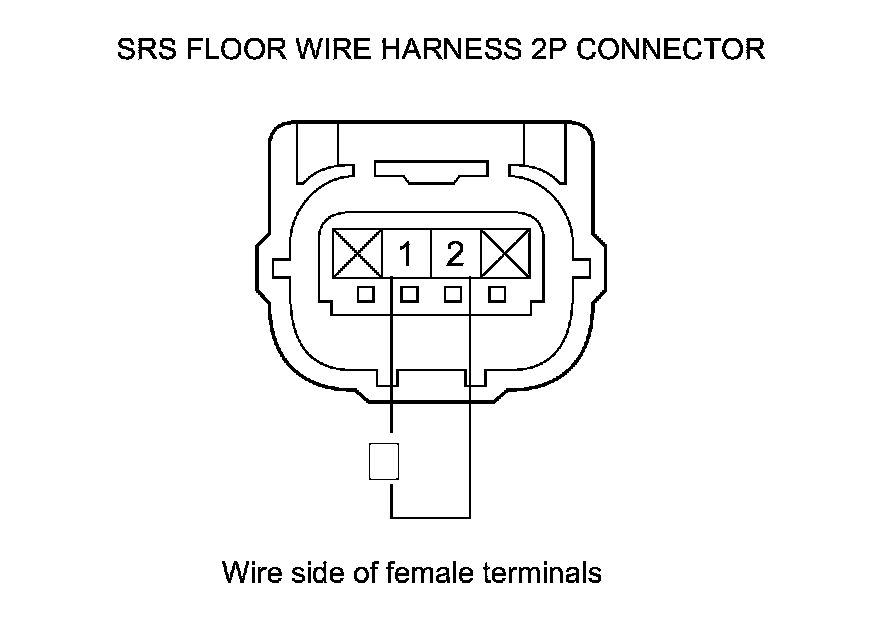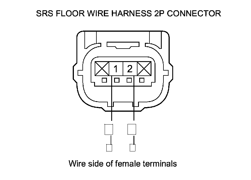 9. Measure the resistance between body ground and SRS floor wire harness 2P connector terminals No. 1 and No. 2 individually. There should be an open circuit or at least 1 MOhms.
