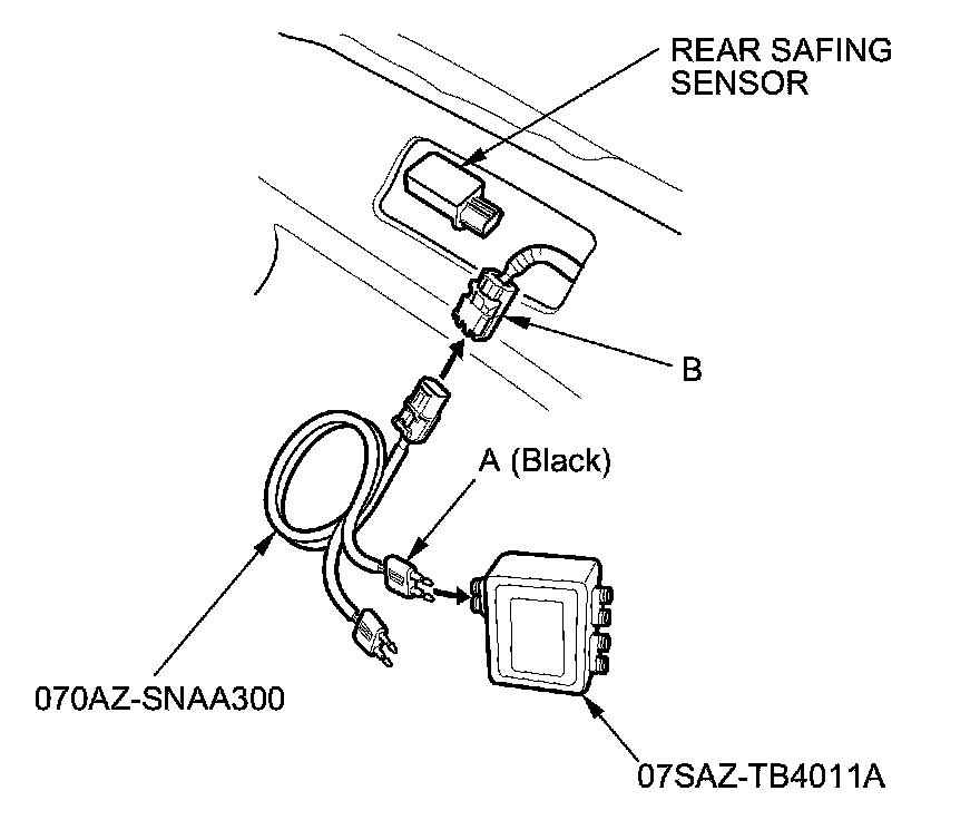 14. Connect the SRS inflator simulator (jumper connector) and the black lead (A) of simulator lead L to the SRS floor wire harness 4P connector (B).