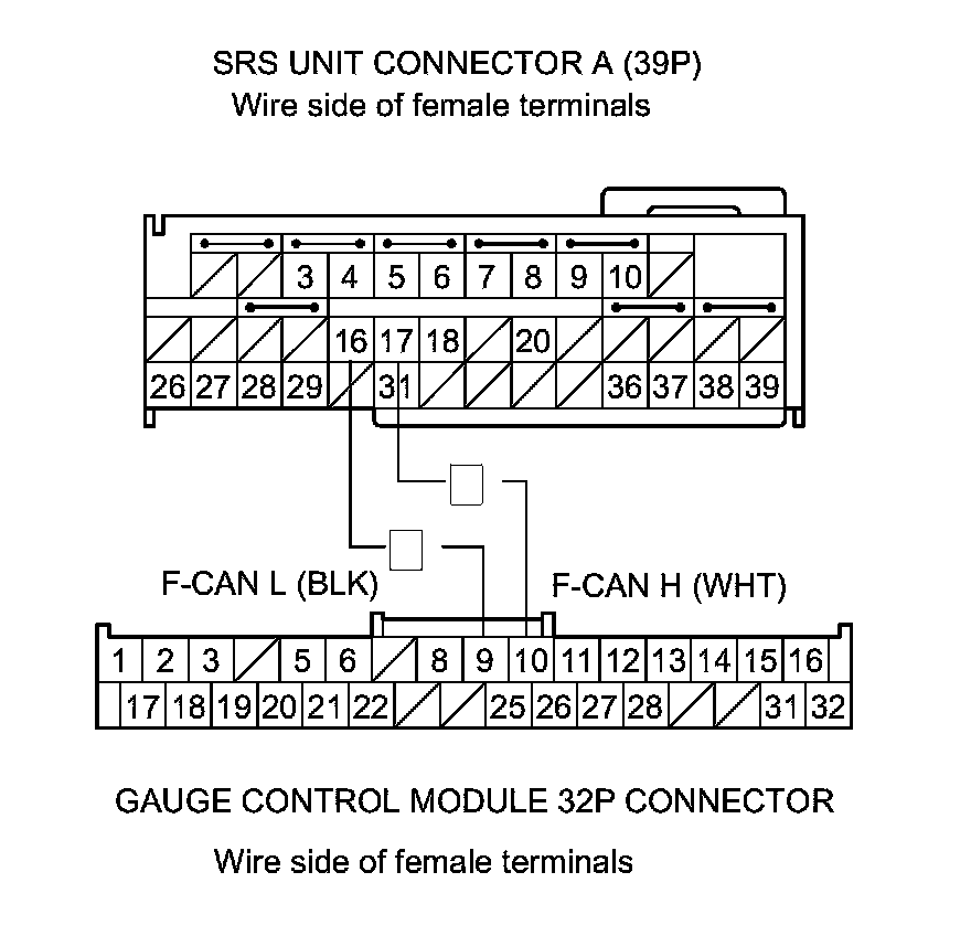 Open in the harness between the SRS unit connector A (39P) terminal No. 16 and gauge control module 32P connector terminal No. 9, or between the SRS unit connector A (39P) terminal No. 17 and terminal No. 10; replace the faulty harness.�