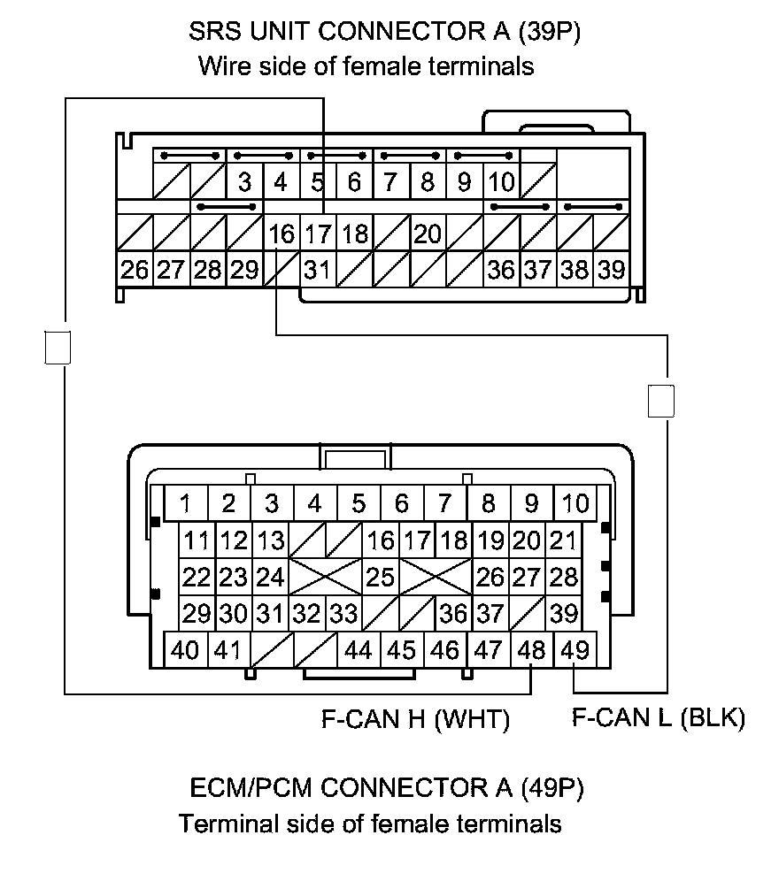 12. Check for continuity between SRS unit connector A (39P) terminal No. 16 and ECM/PCM connector A (49P) terminal No. 49, and between SRS unit connector A (39P) terminal No. 17 and ECM/PCM connector A (49P) terminal No. 48.