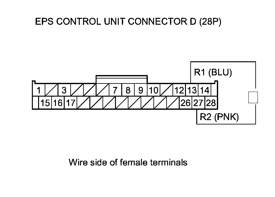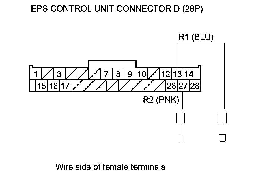 9. Measure the resistance between the EPS control unit connector D (28P) terminal No. 13 and No. 27.