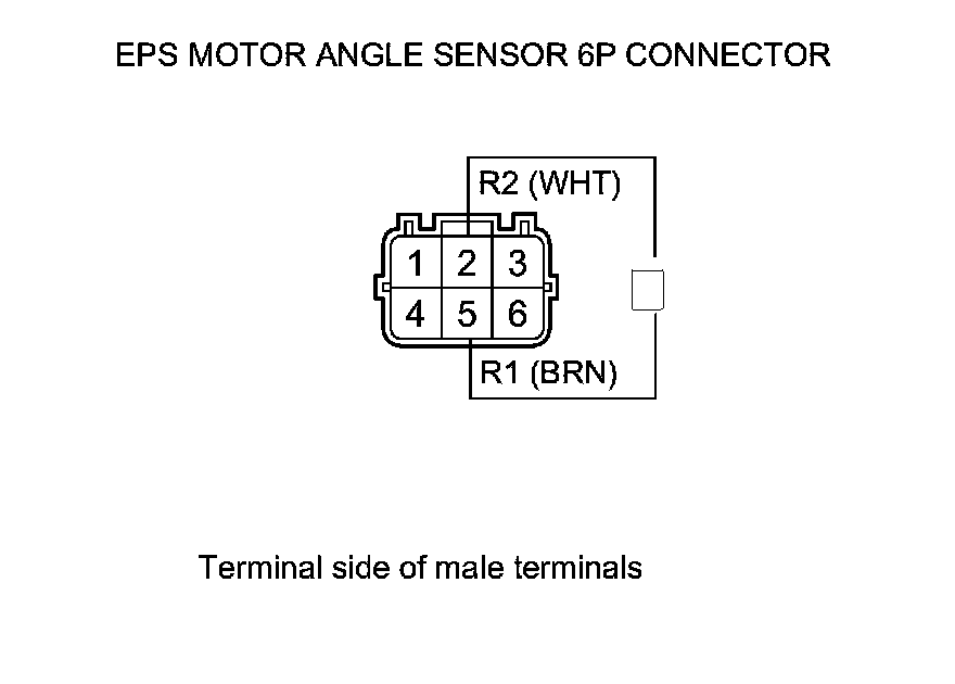 14. On the sensor side, measure the resistance between the EPS motor angle sensor 6P connector terminals No. 2 and No. 5.
