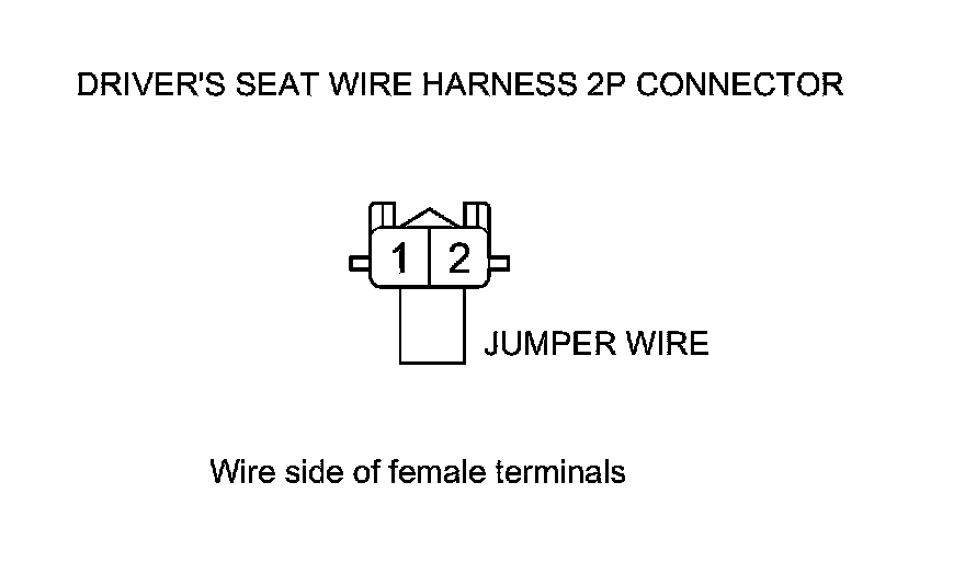9. Install a jumper wire between driver's seat wire harness 2P connector terminals No. 1 and No. 2.