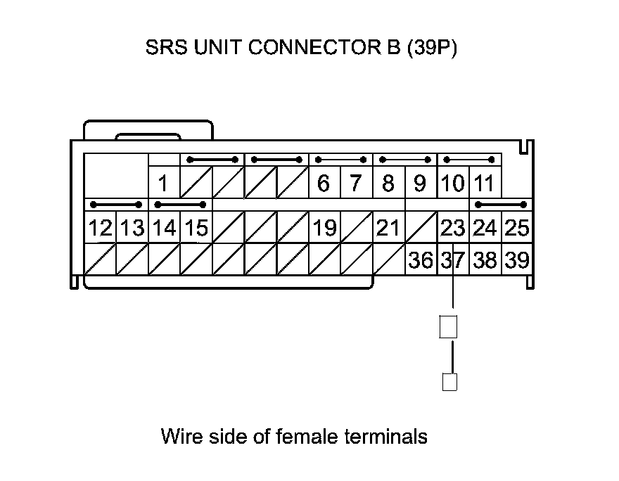 12. Measure the resistance between SRS unit connector B (39P) terminal No. 23 and body ground. There should be less than 1.0 Ohms.