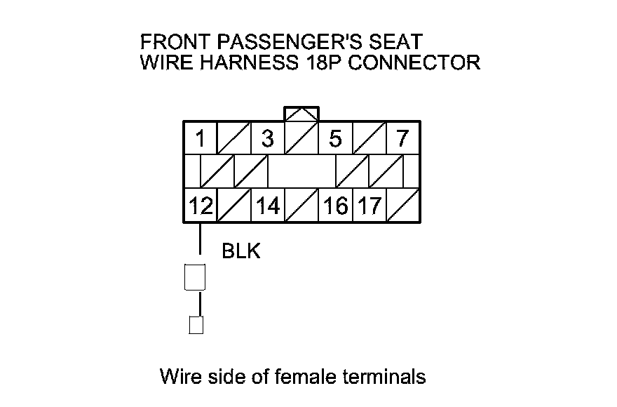 10. Measure the voltage between front passenger's seat wire harness 18P connector terminal No. 1 and body ground. There should be battery voltage.