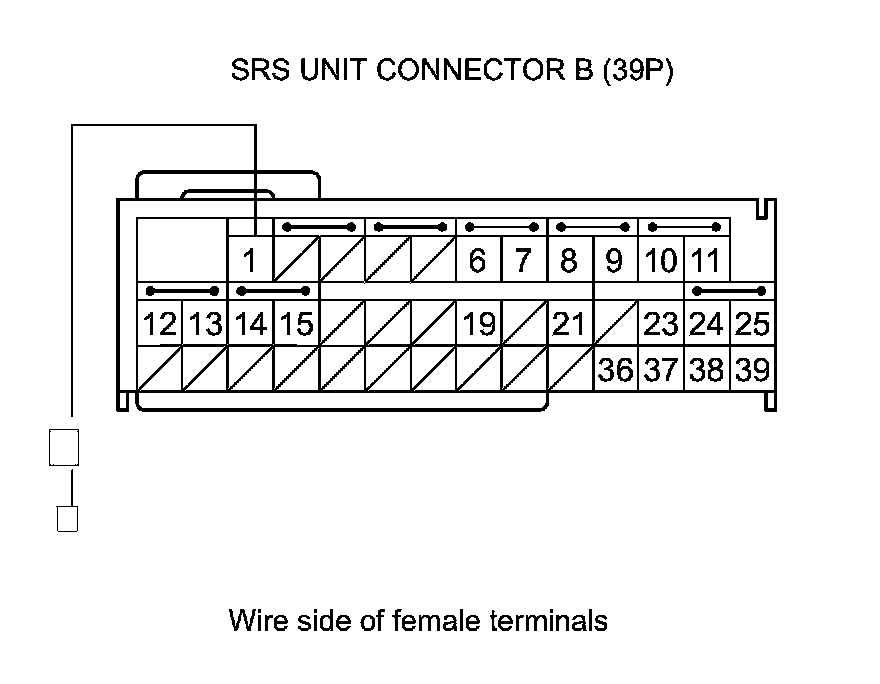 15. Measure the resistance between SRS unit connector B (39P) terminal No. 1 and body ground. There should be an open circuit or at least 1 MOhms.