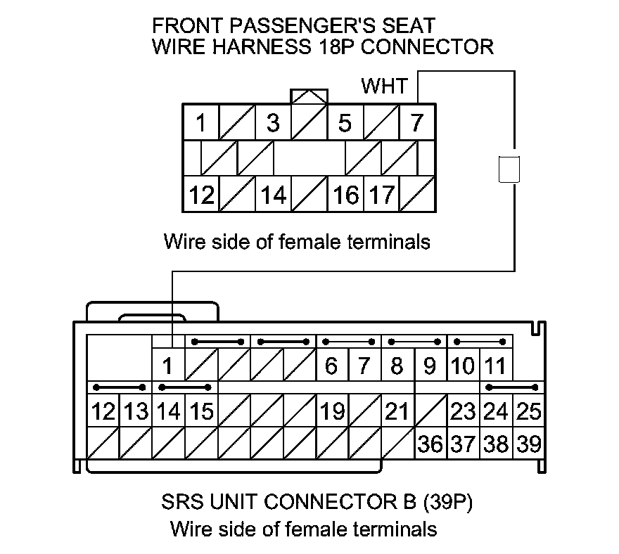 20. Measure the resistance between SRS unit connector B (39P) terminal No. 1 and front passenger's seat wire harness 18P connector terminal No. 7. There should be less than 1.0 Ohms.
