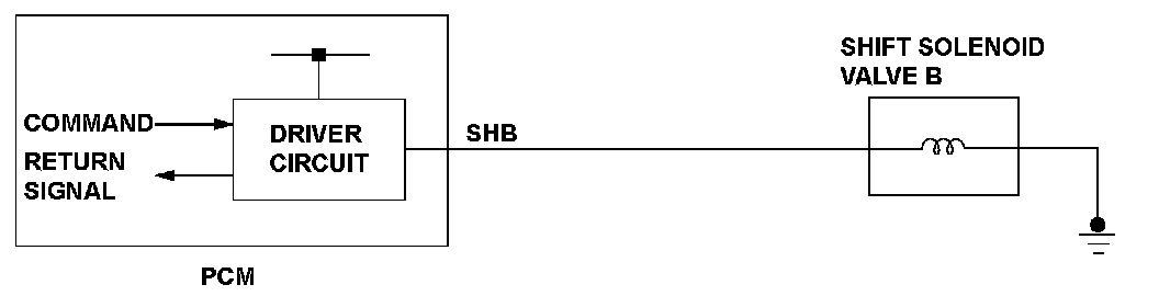When shift solenoid valves A and D are turned ON, or when shift solenoid valves B and C are turned OFF, the hydraulic pressure circuit opens. The hydraulic pressure circuit supplies/discharges hydraulic pressure to/from each clutch according to the combination of the ON/OFF status of the shift solenoid valves. The powertrain control module (PCM) commands the driver circuit to turn on the shift solenoid valve. The circuit diagnoses malfunctions such as a circuit short or open, and sends back a return signal during the PCM's command. When the return signal does not match the PCM command to turn ON the shift solenoid valve, the PCM detects a malfunction and stores a DTC.