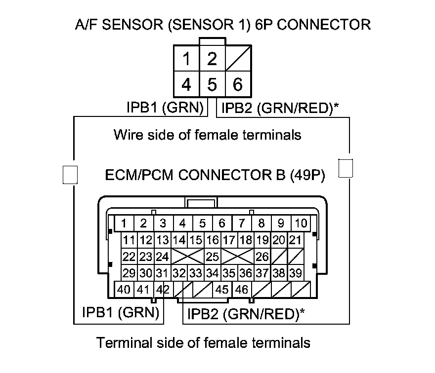 Repair open in the wire between the ECM/PCM (B31 (B32)*) and the A/F sensor (Sensor 1), then go to step 14.