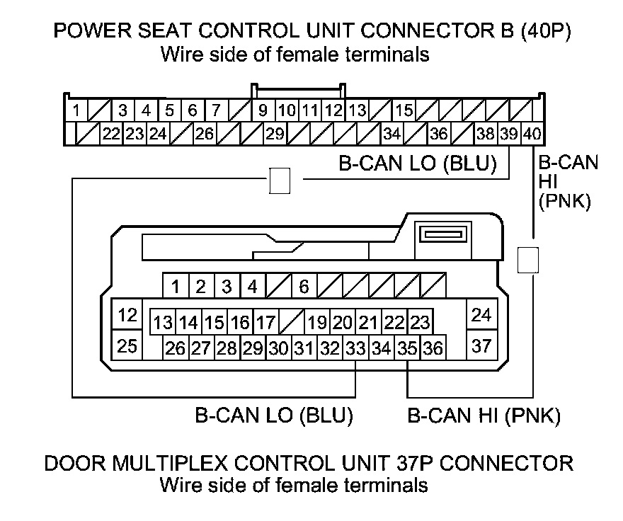 9. Check for continuity between power seat control unit connector B (40P) terminals No. 39 and No. 40 and door multiplex control unit 37P connector terminals No. 33 and No. 35 individually.