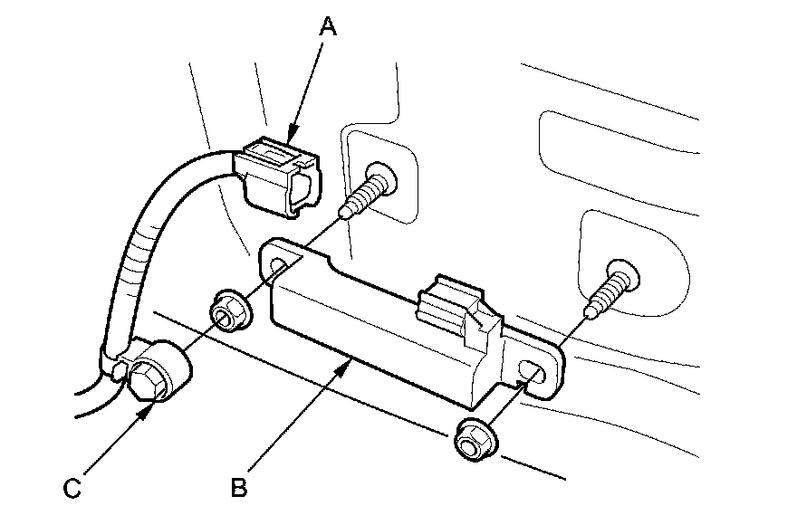 2. Disconnect the 2P connector (A) from the rear bumper LF antenna (B) and remove the harness clip (C).