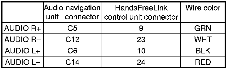 10. Check for continuity between audio-navigation unit connector C (14P) and the HandsFreeLink control unit 28P connector according to the table.
