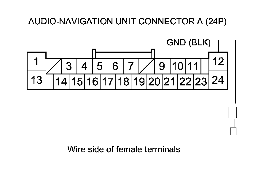 5. Measure the voltage between audio-navigation unit connector A (24P) terminal No. 12 and body ground.