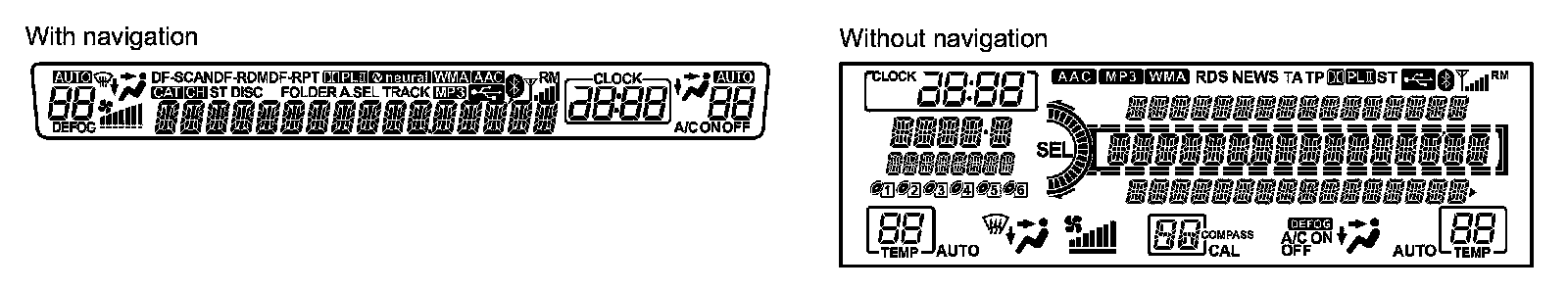 All the segments in the display must appear. If there are dead segments, replace the audio-navigation switch panel Audio-Navigation Switch Panel Removal/Installation, or the audio-HVAC display unit Audio-HVAC Display Unit Removal/Installation (Without Navigation).