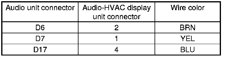 8. Check for continuity between audio unit connector D (20P) and the audio-HVAC display unit 12P connector according to the table.