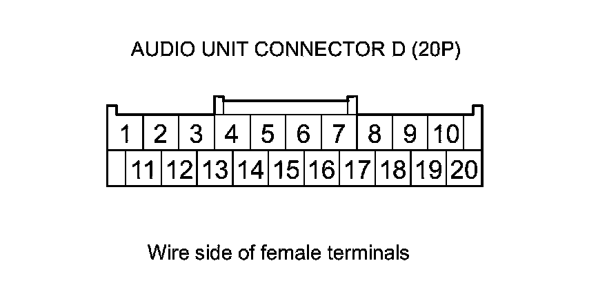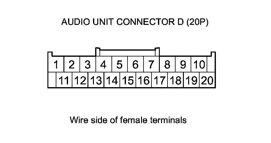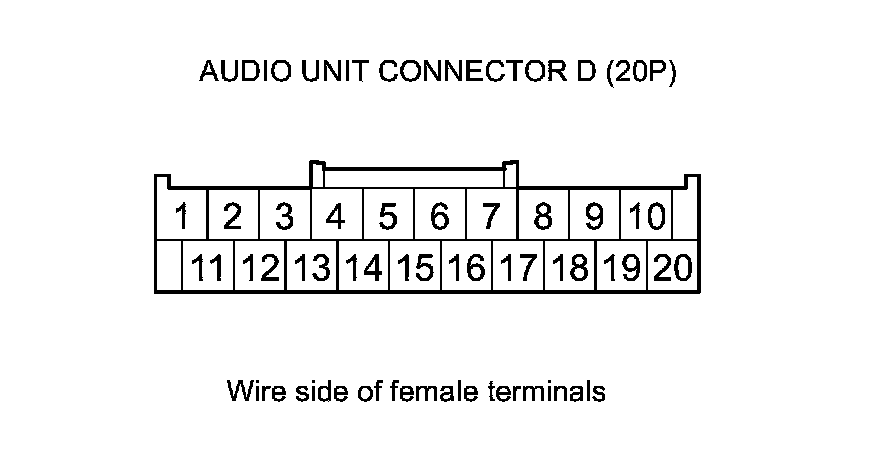 9. Check for continuity between the terminals of the audio unit connector D (20P) and body ground according to the table.