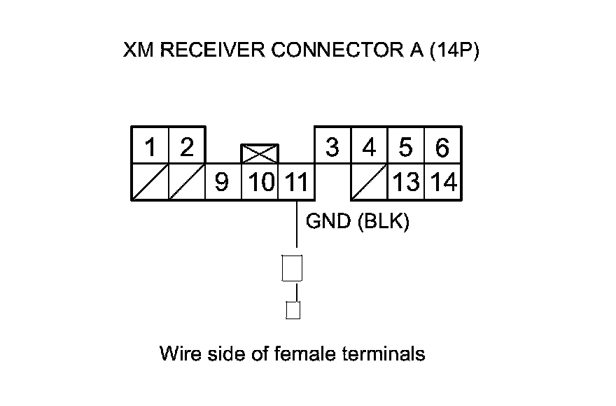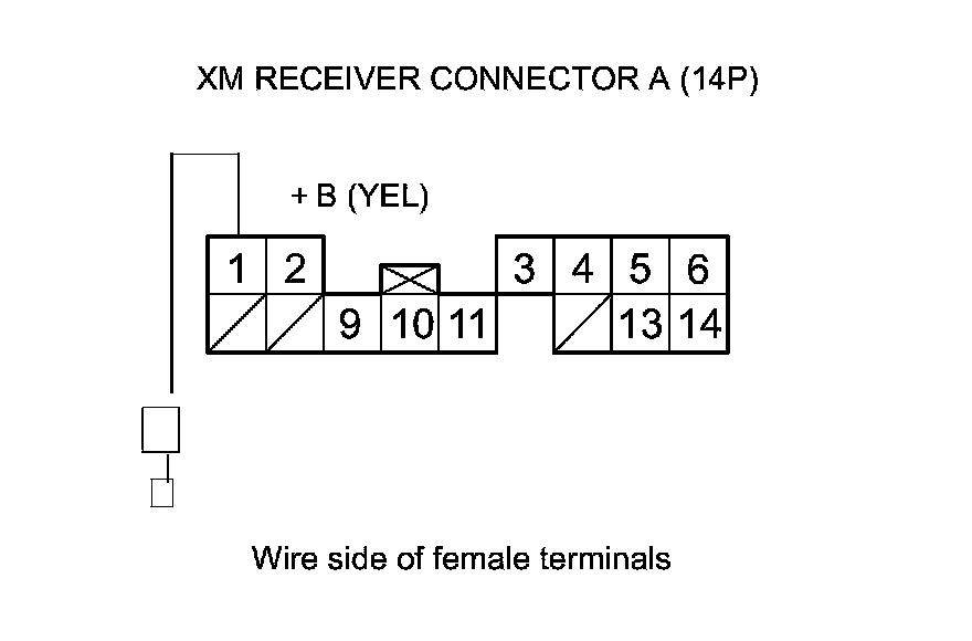 8. Measure the voltage between XM receiver connector A (14P) terminal No. 1 and body ground.
