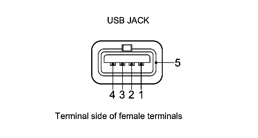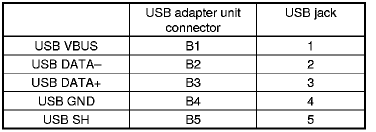 9. Check for continuity between USB adapter unit connector B (5P) and the USB jack according to the table.