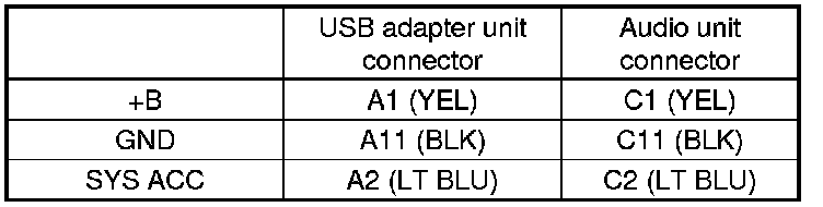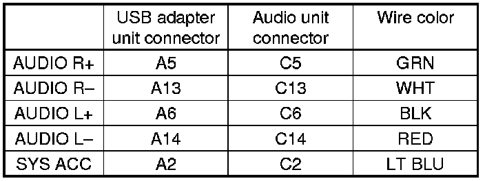 13. Check for continuity between USB adapter unit connector A (14P) and audio unit connector C (14P) according to the table.