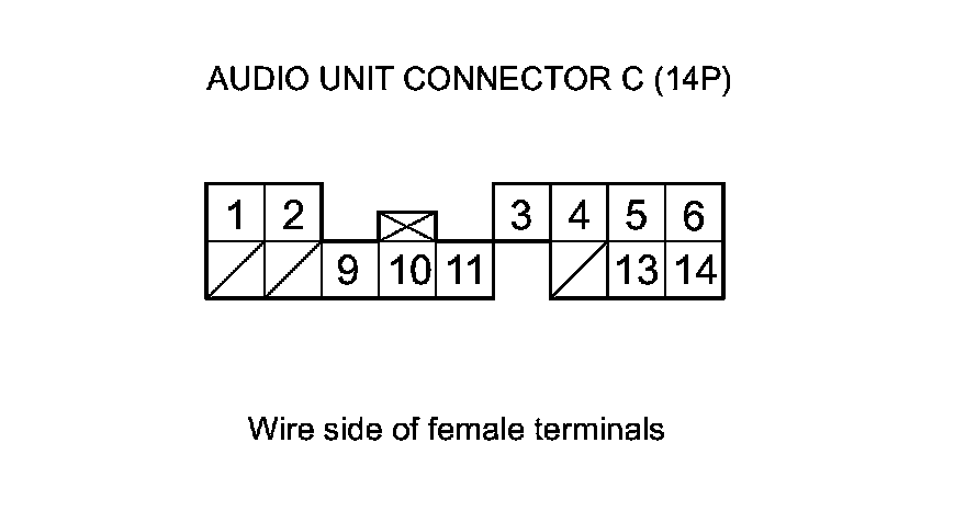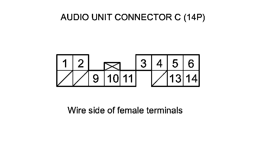 23. Check for continuity between the terminals of audio unit connector C (14P) according to the table.
