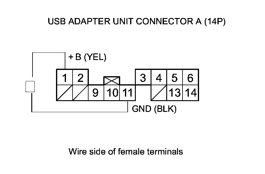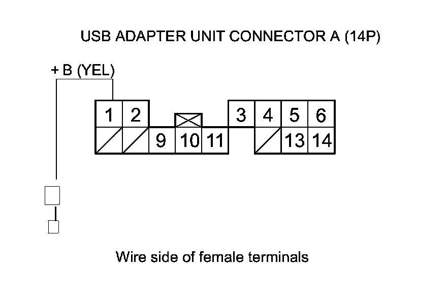 17. Measure the voltage between USB adapter unit connector A (14P) terminals No. 1 and No. 11.