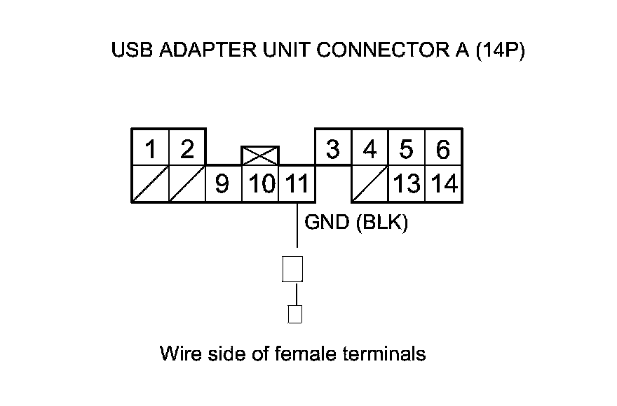 22. Check for continuity between body ground and USB adapter unit connector A (14P) terminals No. 2, No. 9, and No. 10 individually.