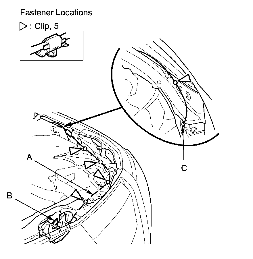 3. Detach the clips with a clip remover, and remove the grommet (C) from the body, then remove the hood opener cable from the vehicle.