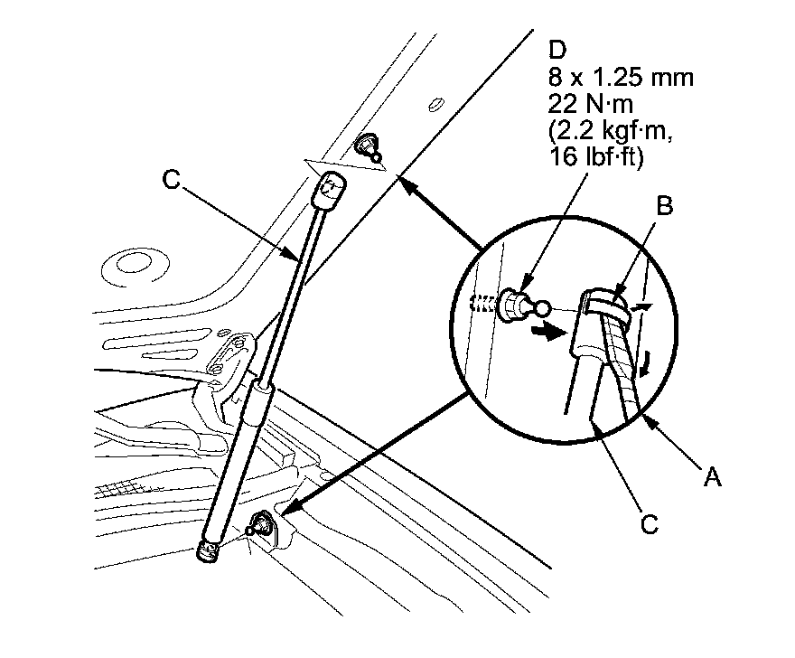 1. With the help of an assistant, use a flat-tip screwdriver (A) to pry out the clips (B) on both ends of the hood support struts (C), and then remove the support struts from the pivot bolts (D). Do not remove the clips from the struts.