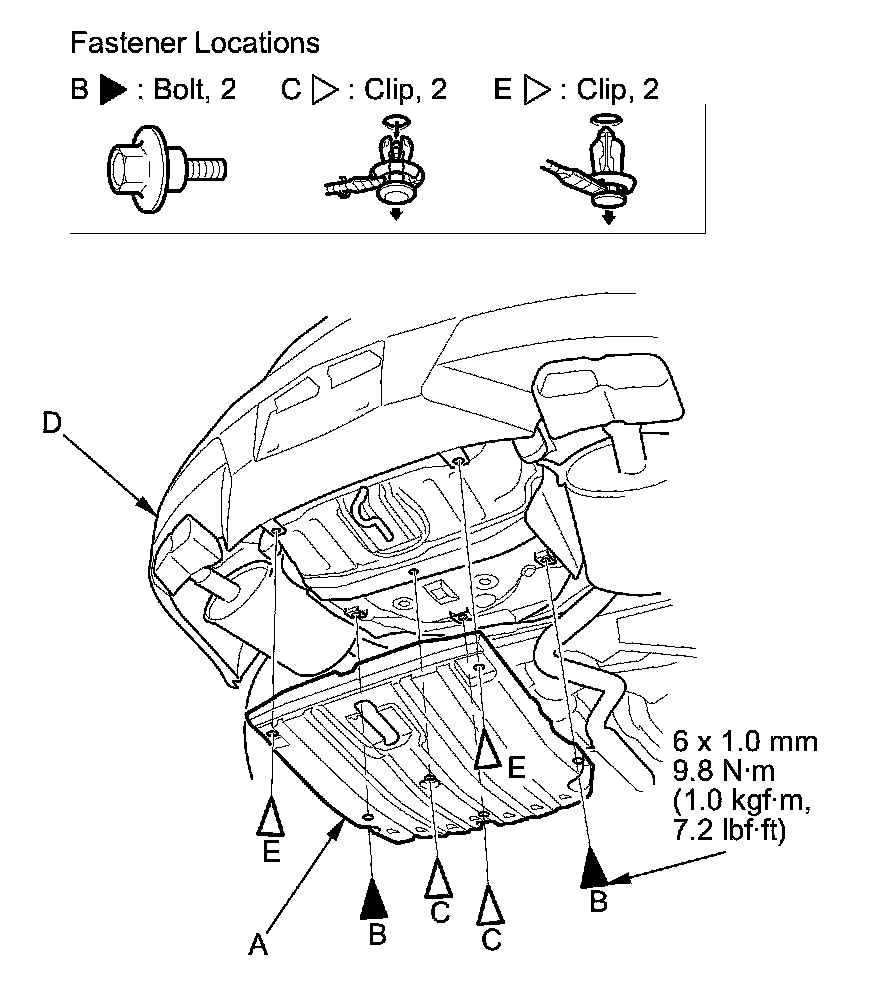 1. Remove the bolts (B) and detach the clips (C) that secure the undercover to the body.