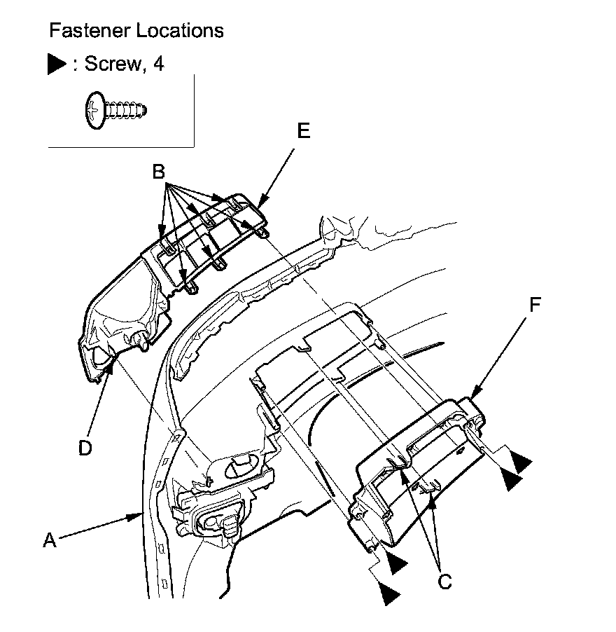 3. Remove the screws from back of the front bumper (A), and release the hooks (B, C, D), then remove the lower front bumper grille (E) and the fog light housing (F).