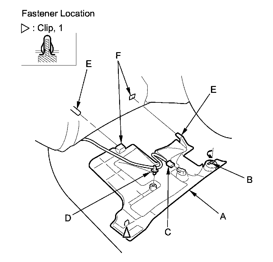 4. Pull the undercover rearward to release the pins (E) from the brackets (F).