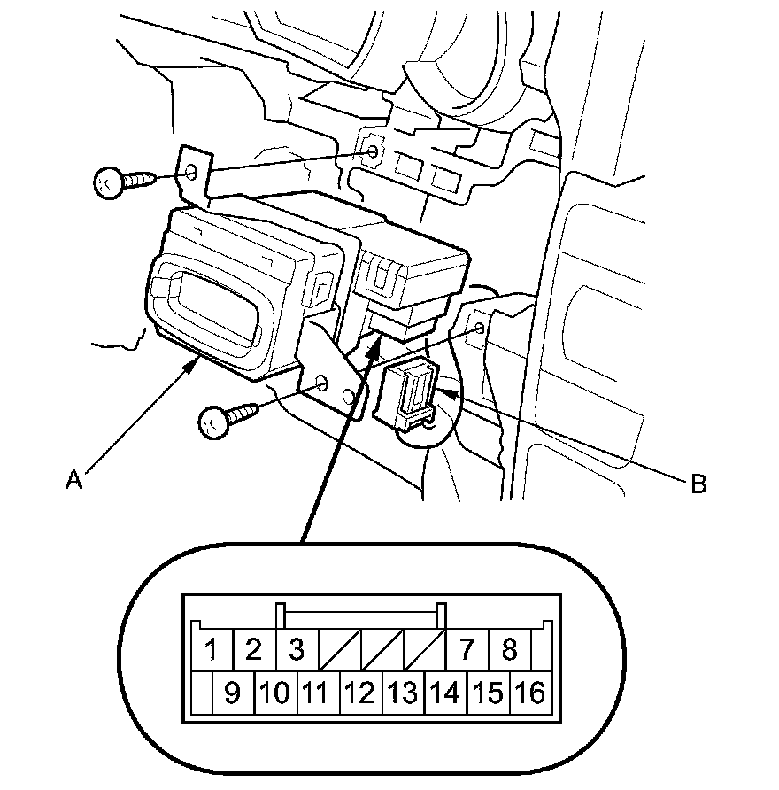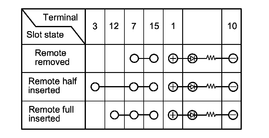 8. Connect the positive battery terminal to remote slot connector terminal No. 16, and the negative battery terminal to terminal No. 8. Check that the remote cannot be removed from the remote slot. Connect the positive battery terminal to remote slot connector terminal No. 8, and the negative battery terminal to terminal No. 16. Check that the remote can be removed from the remote slot.