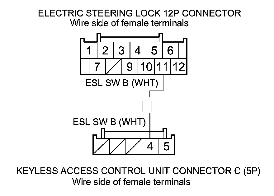 32. Check for continuity between electric steering lock 12P connector terminal No. 11 and keyless access control unit connector C (5P) terminal No. 4.