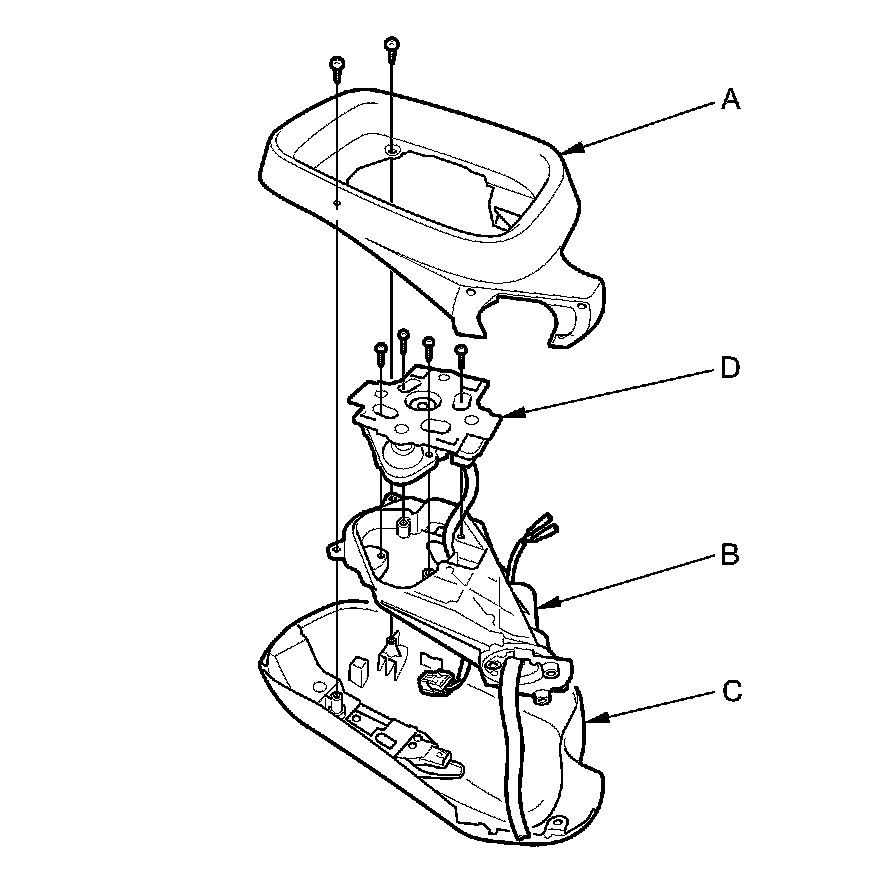 6. Remove the three screws, separate the mirror bracket (B), then remove screw, separate the seal (C) from the housing (D).