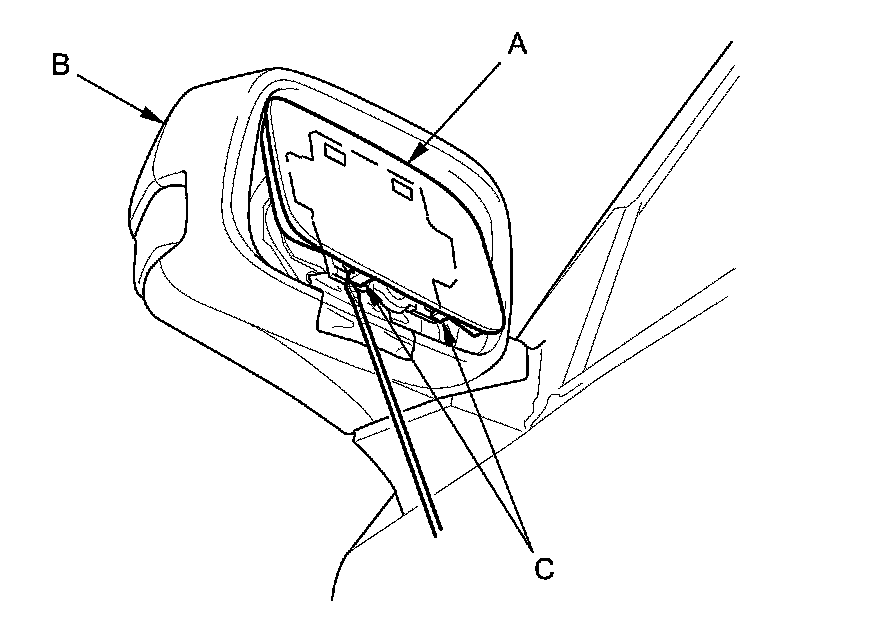 2. Put a shop towel in the opening between the bottom edge of the mirror holder and the mirror housing (B) to prevent scratches. Insert a flat-tip screwdriver under the mirror holder, and detach the bottom clips (C).