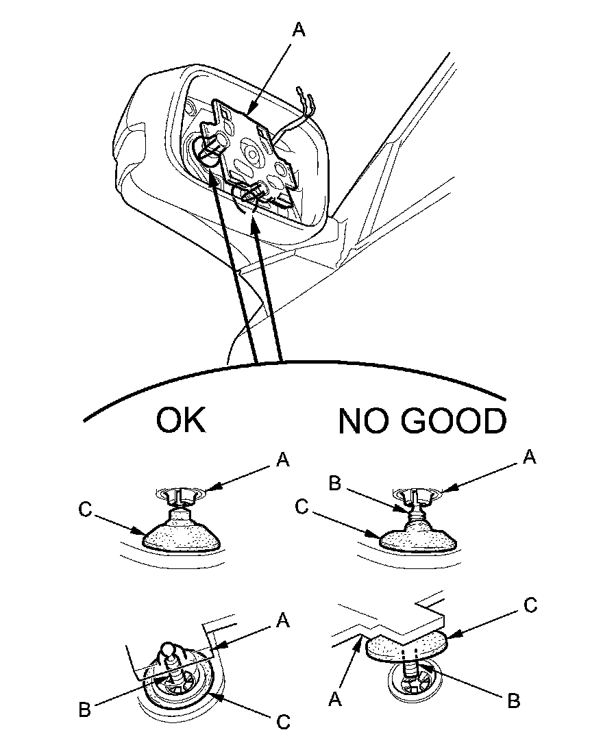 5. Before reinstalling the mirror holder to the inner holder (A) on the actuator, check the actuator rods (B) and the actuator boots (C).