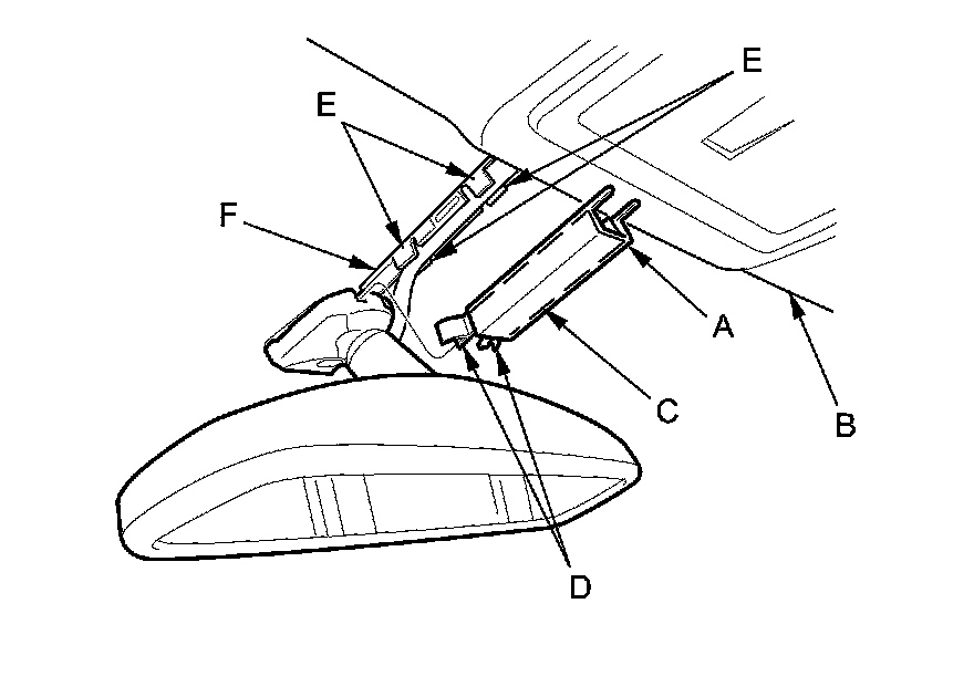 1. Slide the rearview mirror harness upper cover (A) forward to release it from the headliner (B). Pry out the rearview mirror harness lower cover (C) to release the hooks (D), then slide the lower cover rearward, and remove the lower cover by releasing the hooks (E) on the rearview mirror harness cover base (F).
