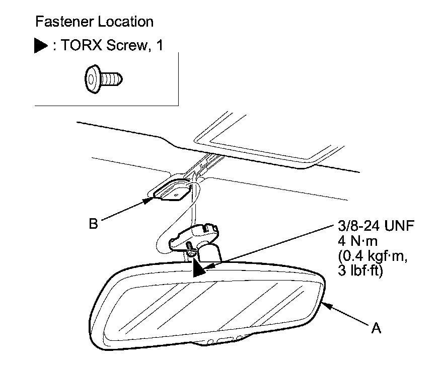 3. Loosen the TORX screw with a TORX T20 bit, then slide the rearview mirror (A) rearward and off the mount (B).