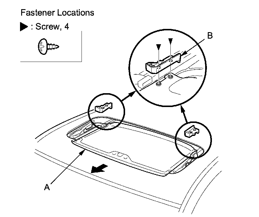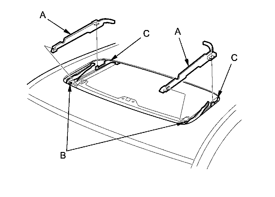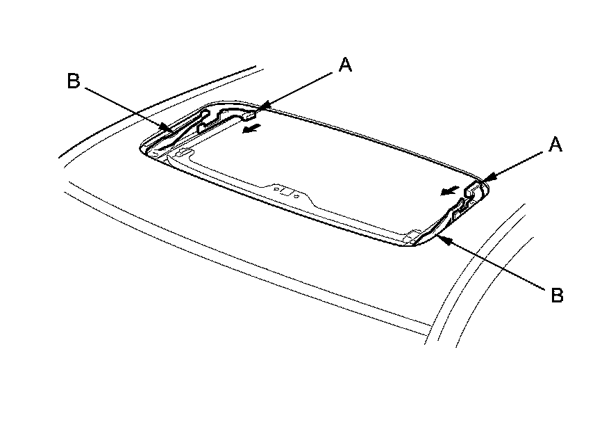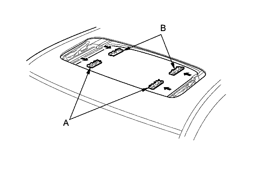 9. Remove both front sunshade base sliders (A) and both rear sunshade base sliders (B).