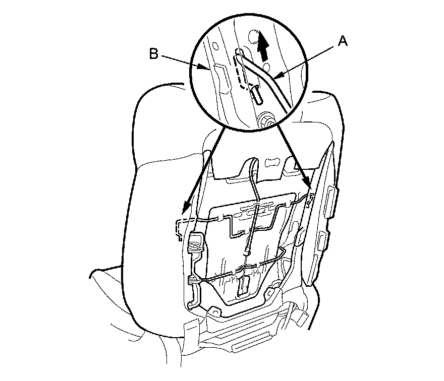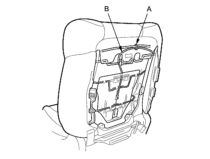 5. Remove the upper wire (A) from both seat-back side frames (B) inside the seat-back.