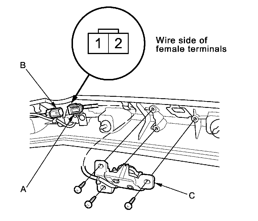 3. Remove the three screws, and the trunk lid spoiler switch (C).