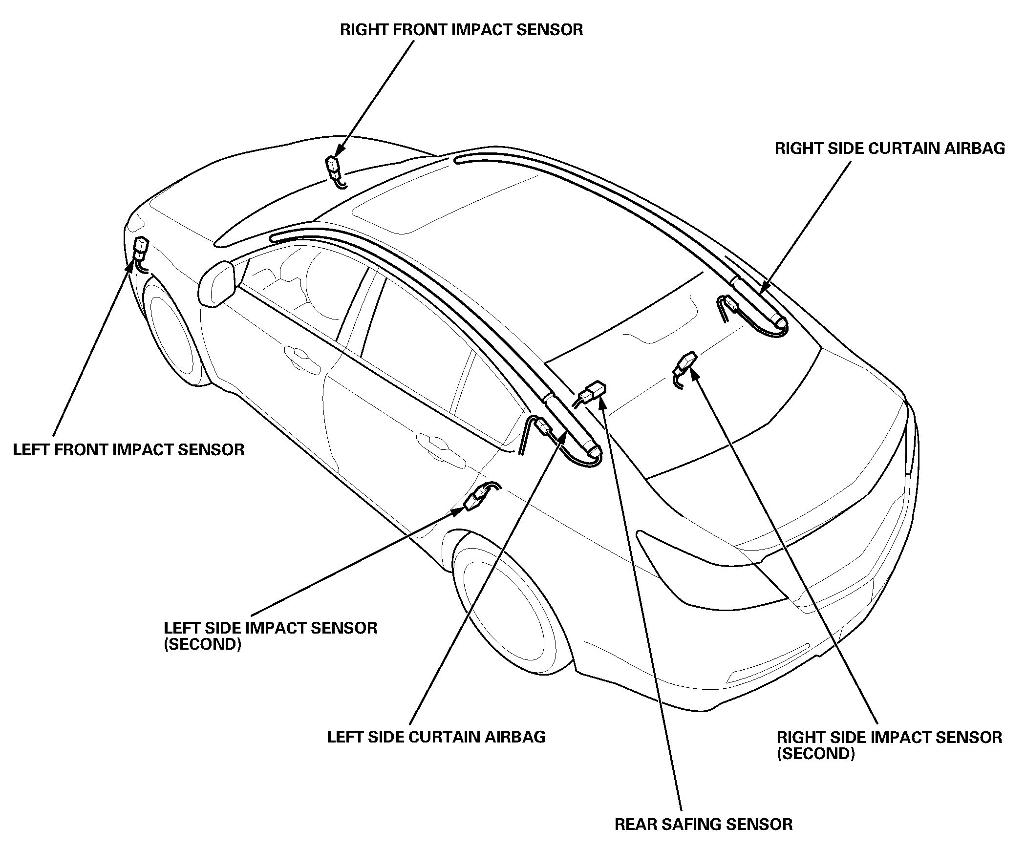 - The SRS unit (including the safing sensor and the impact sensor) is located under the dashboard and the side impact sensors are located in each side sill and rear wheel arch. The front impact sensors are located behind the right and left ends of the front bumper. Avoid any strong impact with a hammer or other tools when repairing the front side frame, the lower part of the dashboard, the side sill, and rear wheel arch. Do not apply heat to these areas with a torch, etc.